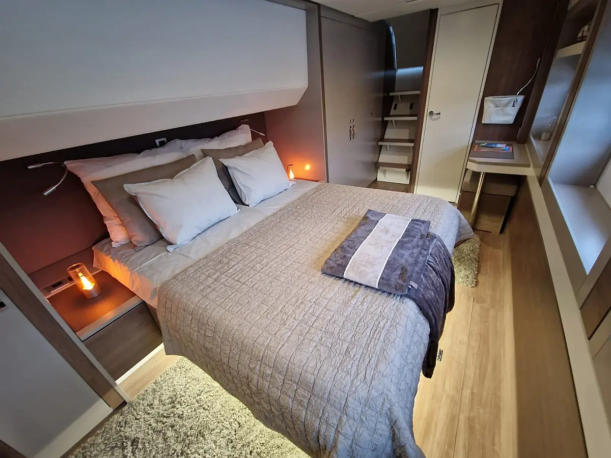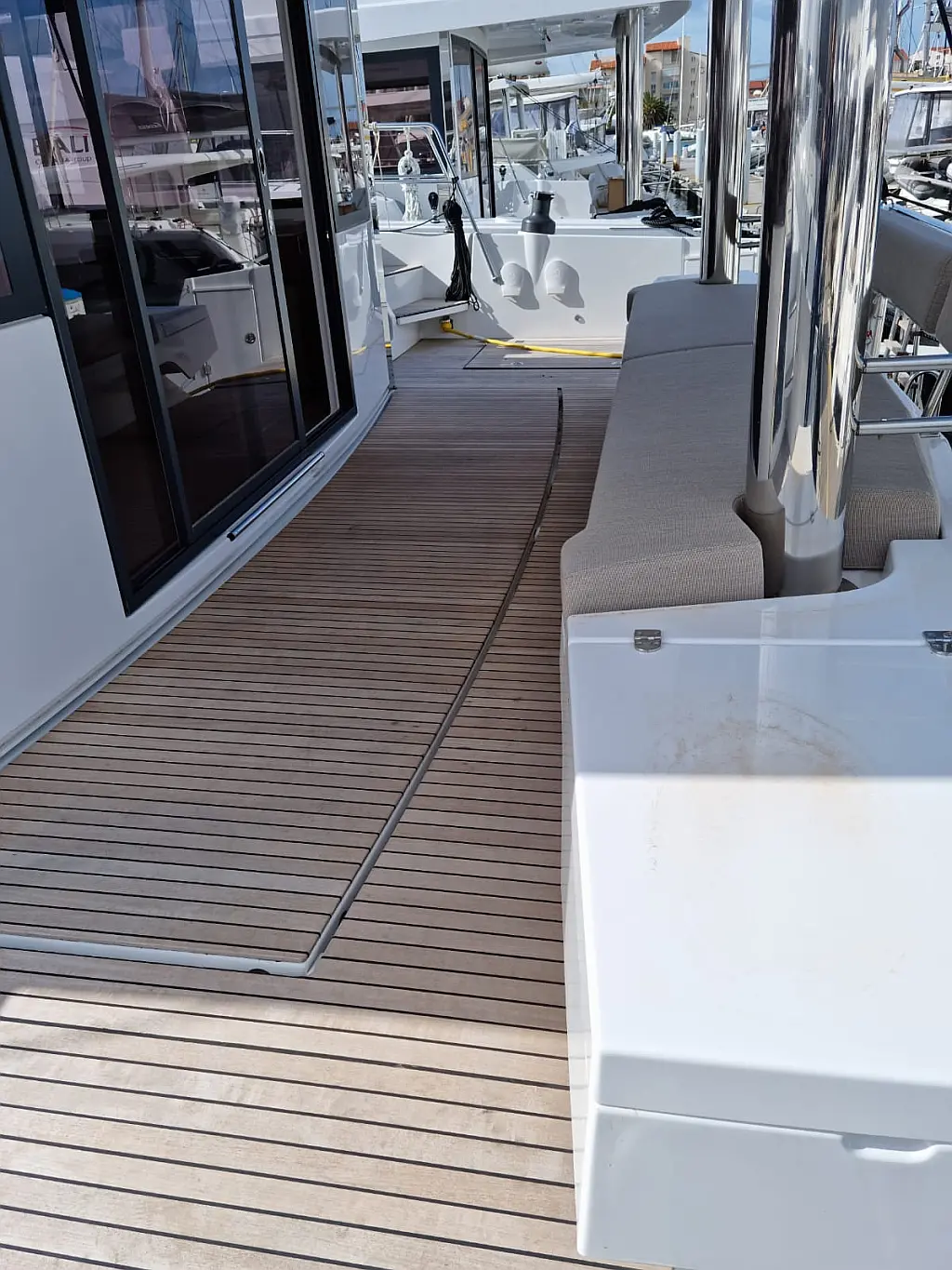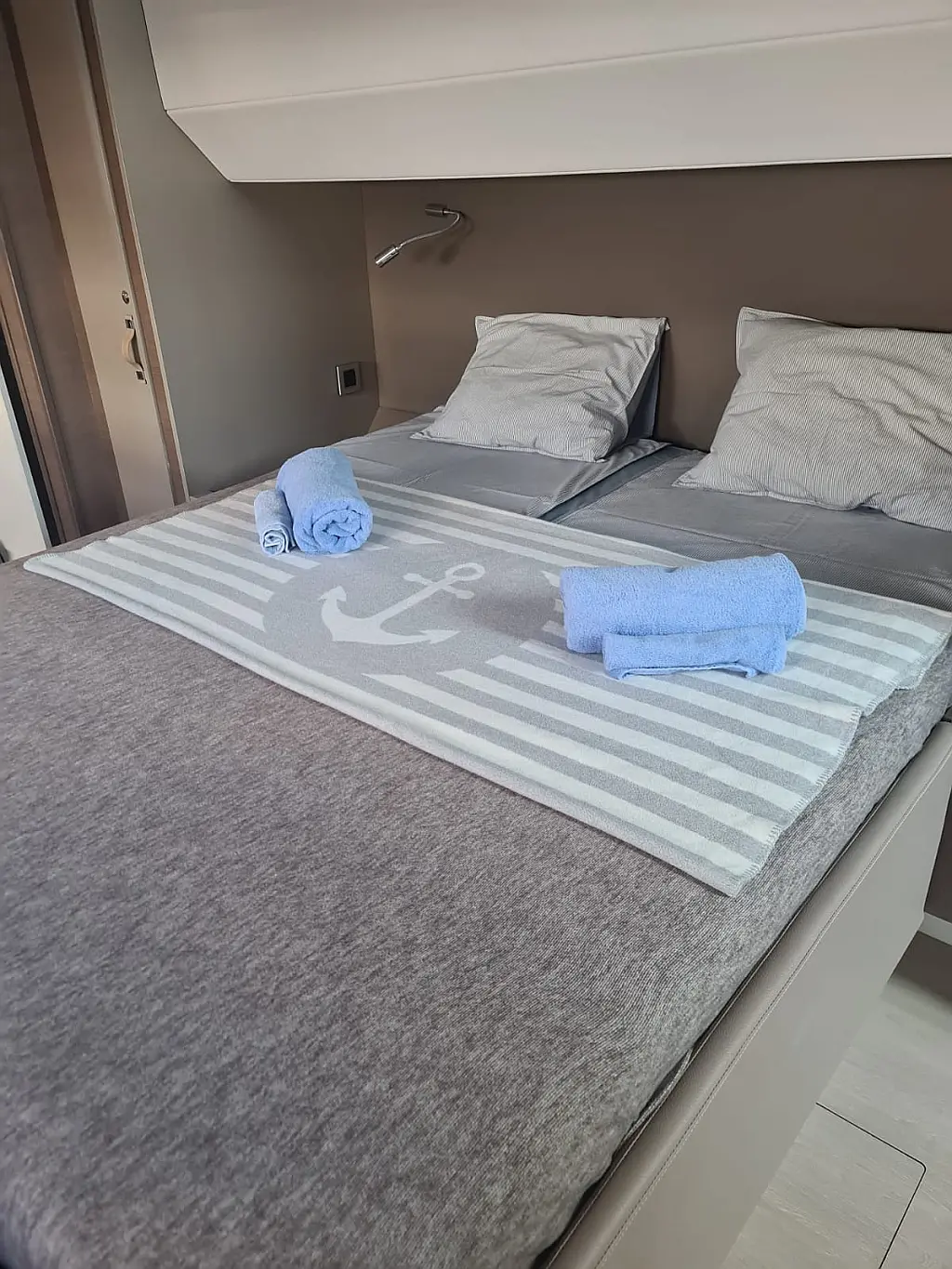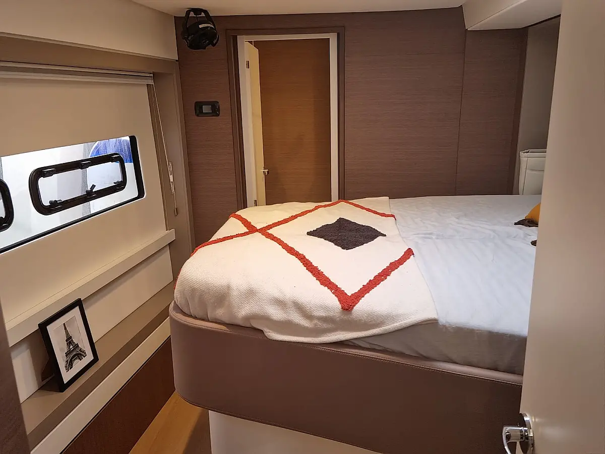 Cockpit cushions, Air condition, Dinghy, Refrigerator, Generator, Barbecue grill in cockpit, Coffee maker, Teak deck, Teak Cockpit, Water maker